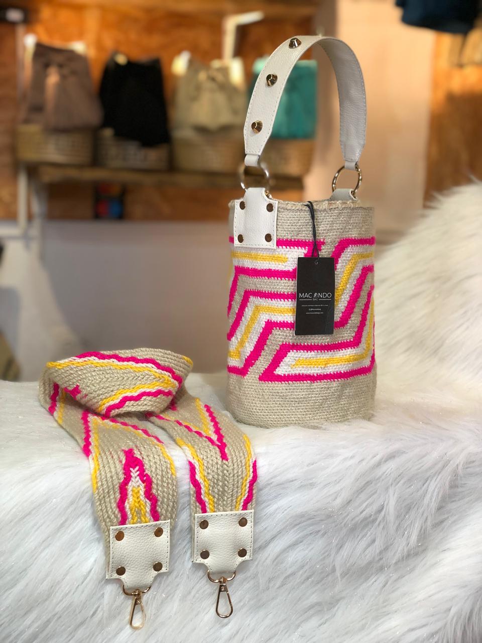 Mochila Tradicional kankuama está tejida a mano por la comunidad kankuama, una de las cuatro etnias principales que habitan la Sierra Nevada de Santa Marta - Colombia. Nuestro taller de marroquinería inicia su proceso agregando herrajes de lujo y cuero Original, cuenta con doble Gaza o correa por lo cual es un producto Multiusos, se puede llevar de Mano o también mochila Sus medidas son:  22 cm de alto x 18 cm de ancho  El proceso de elaboración es extenso debido a la precisión y el cuidado con que se realiza el bordado de la mostacillla detalle por detalle. Esta mochila, que toma aproximadamente 40 días en su confección, está disponible para envío inmediato.