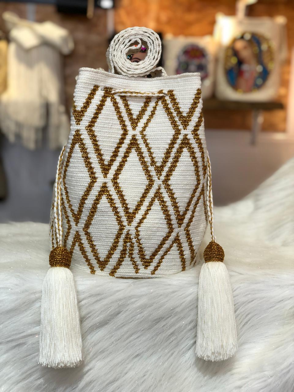 Our large backpack with shimmering thread details is handcrafted by the Wayuu people on the Guajira Peninsula in Colombia . Made with high-quality cotton and adorned with fine silk thread details , each piece reflects the rich artisanal tradition of this community, adding a touch of elegance and distinction. Measuring 29 cm high and 29 cm wide, and with a 110 cm hanging strap, it is the ideal accessory for those seeking functionality, comfort and authentic style. All products in this catalog, including this beautiful backpack, are available for immediate delivery.