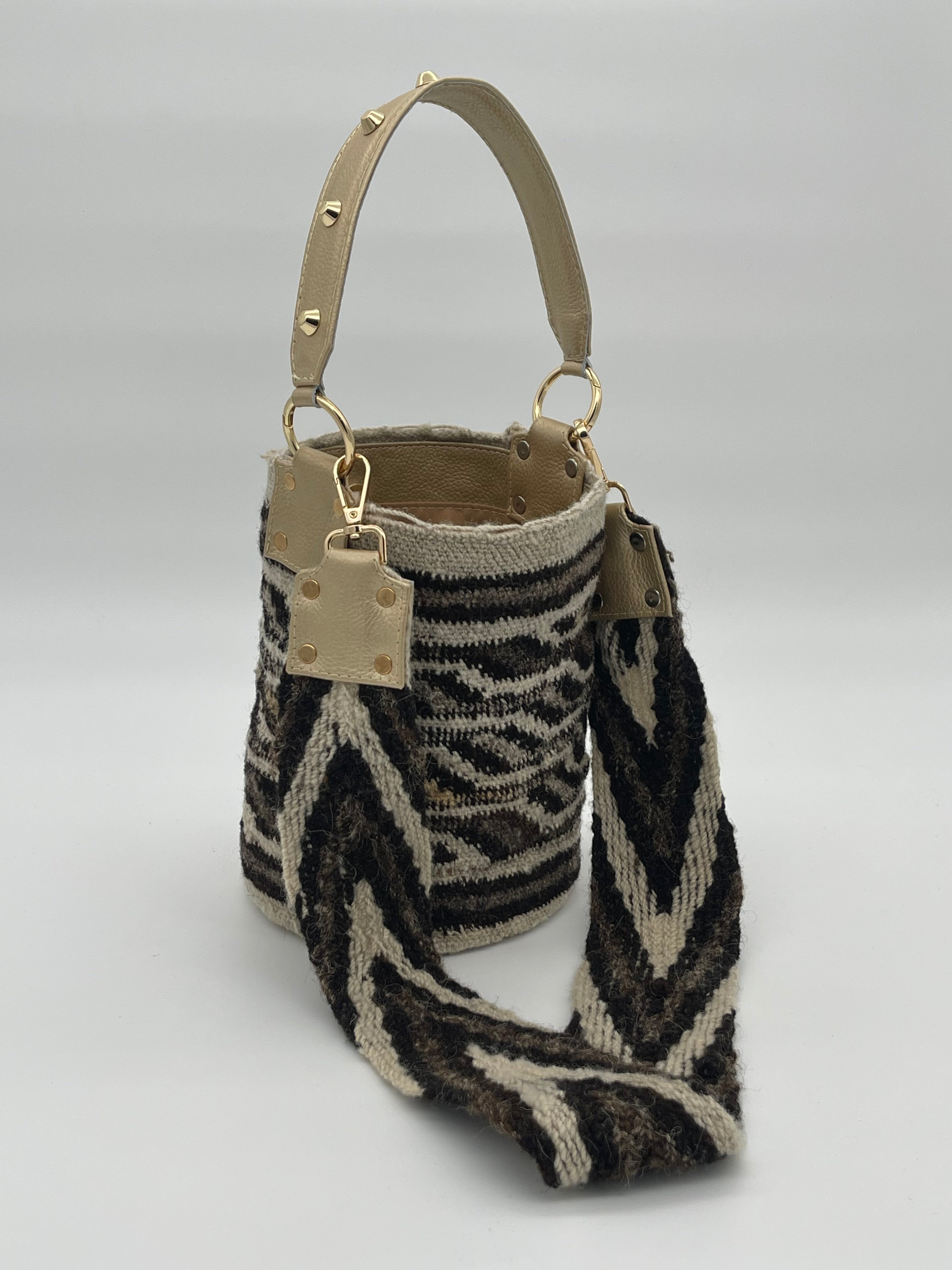 Mochila Tradicional Arhuaca Recamada está tejida a mano por la comunidad Arhuaca, una de las cuatro etnias principales que habitan la Sierra Nevada de Santa Marta - Colombia, posteriormente es recamada por nuestras artesanas, un equipo de trabajo conformado por más de 25 madres cabeza de hogar ubicadas en algunos municipios del Eje Cafetero. Los recamados son hechos con mostacilla checa de alta calidad. Nuestro taller de marroquinería inicia su proceso agregando herrajes de lujo y cuero Original, cuenta con doble Gaza o correa por lo cual es un producto Multiusos, se puede llevar de Mano o también mochila Sus medidas son:  23 cm de alto x 22 cm de ancho  Gaza 88 cm  El proceso de elaboración es extenso debido a la precisión y el cuidado con que se realiza el bordado de la mostacillla detalle por detalle. Esta mochila, que toma aproximadamente 40 días en su confección, está disponible para envío inmediato.