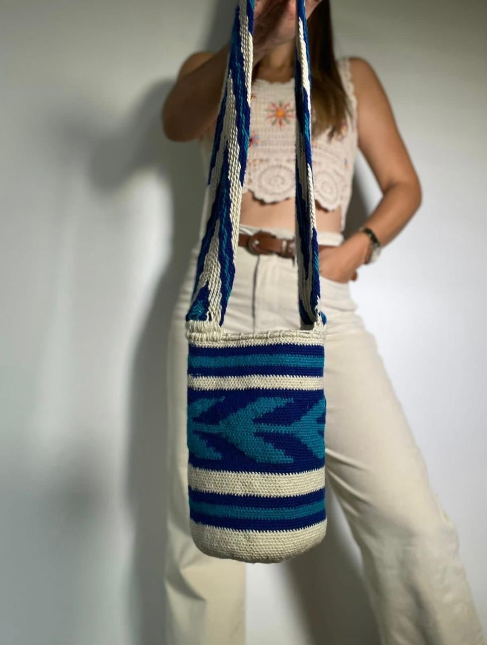 Mochila confeccionada con lana combinada (virgen e industrial) con diseño novedoso, que cautiva por la singularidad de sus colores. Esta tejida a mano por la comunidad Kankuama, una de las cuatro principales etnias que habitan la Sierra Nevada de Santa Marta - Colombia. Sus medidas son 28 cm de alto x 24 cm de ancho, y ofrece un diseño único y resistente. Todos los productos del catálogo están disponibles para envío inmediato.