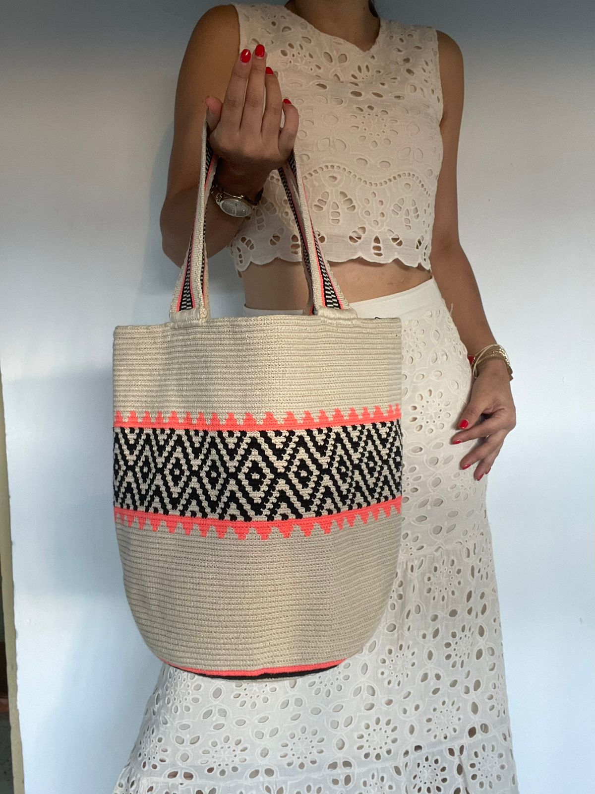 Mochilón Premium, elaborado 100% a mano por la etnia Wayuú en la península de La Guajira. Este mochilón único destaca por su sofisticación y funcionalidad. Cuenta con un forro interno con cremallera, que incluye un práctico bolsillo adicional para mayor organización. El tejido, de excelente calidad, garantiza durabilidad y estilo, mientras que la gaza paleteada corta le da un toque único y elegante. Disponemos de una variedad de colores, desde tonos vibrantes hasta neutros, para adaptarse a cada gusto y estilo. Cada mochilón es una pieza exclusiva y versátil, pensada para quienes buscan un accesorio que combine tradición, modernidad y calidad. Medidas aproximadas: 40 cm de alto x 35 cm de ancho. Todos los productos del catálogo están disponibles para envío inmediato