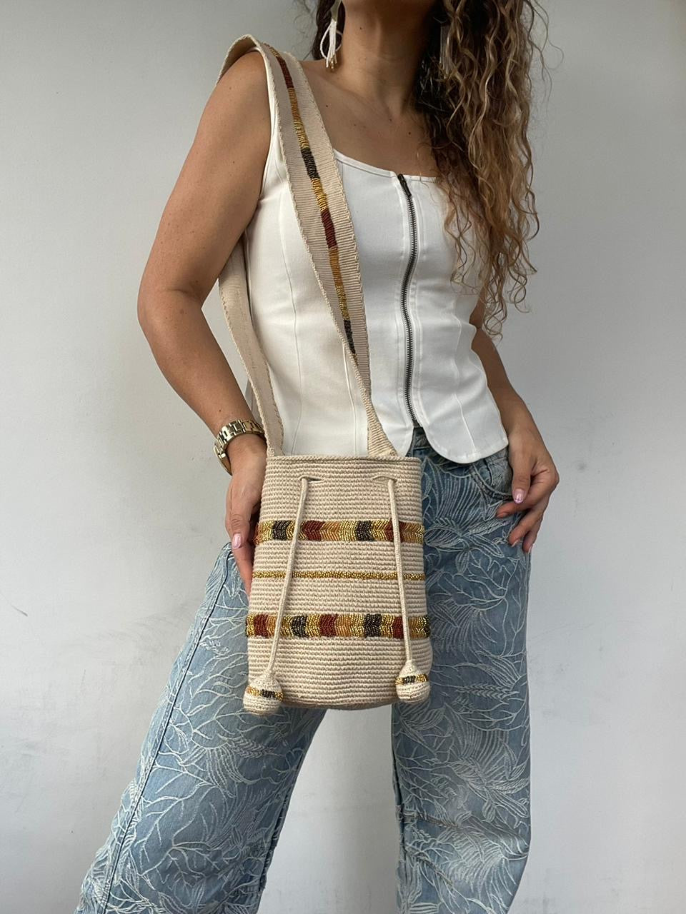 Mochila mediana recamada moderna y única, decorada con mostacilla checa de alta calidad en diferentes diseños. La base es elaborada en La Guajira por la etnia Wayuú, mientras que el recamado lo realiza un equipo de más de 25 madres cabeza de hogar del Eje Cafetero. El bordado, hecho con precisión, resalta en una amplia gama de colores, desde tonos vibrantes hasta los más sutiles. Este proceso meticuloso dura aproximadamente 30 días, lo que garantiza una mochila de gran calidad y belleza. Medidas aproximadas: 22 cm de alto x 21 cm de ancho, su Gaza es de 99 cm de largo Todos los productos del catálogo están disponibles para envío inmediato
