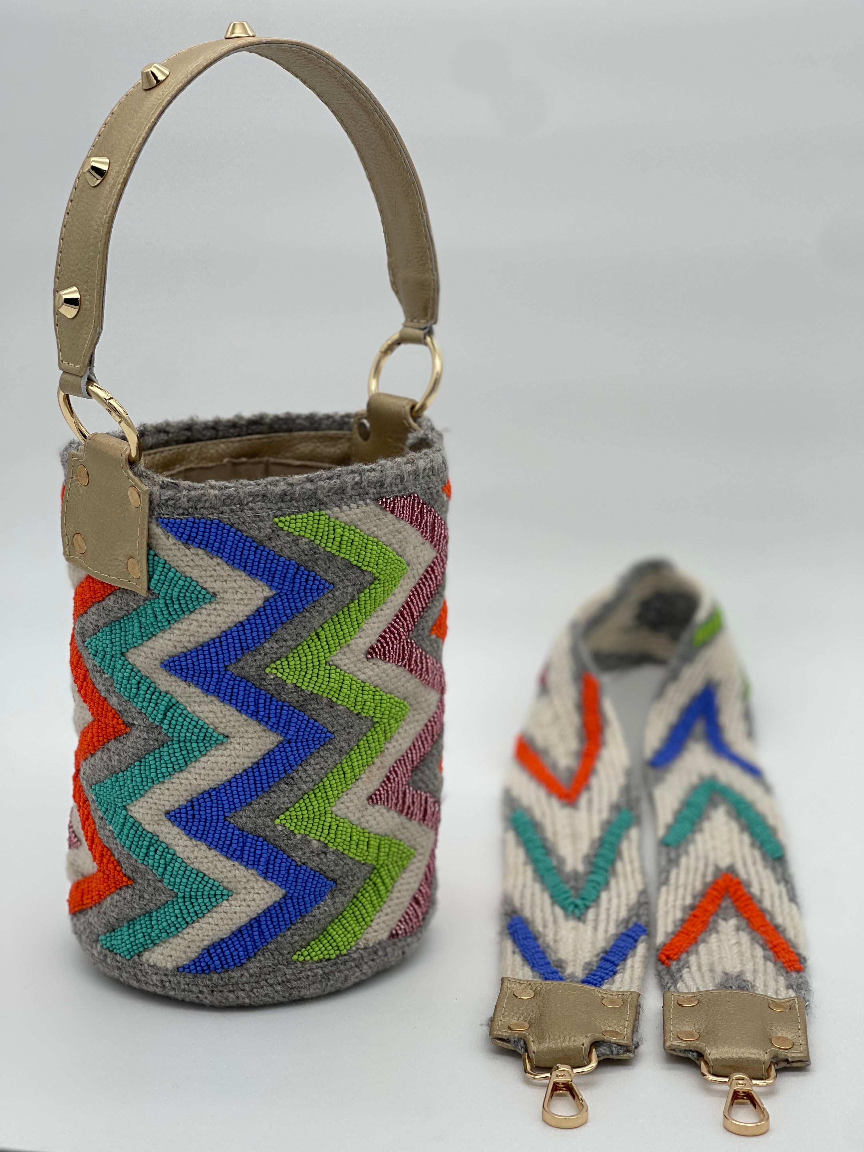 Mochila Tradicional Arhuaca Recamada está tejida a mano por la comunidad Arhuaca, una de las cuatro etnias principales que habitan la Sierra Nevada de Santa Marta - Colombia, posteriormente es recamada por nuestras artesanas, un equipo de trabajo conformado por más de 25 madres cabeza de hogar ubicadas en algunos municipios del Eje Cafetero. Los recamados son hechos con mostacilla checa de alta calidad. Nuestro taller de marroquinería inicia su proceso agregando herrajes de lujo y cuero Original, cuenta con doble Gaza o correa por lo cual es un producto Multiusos, se puede llevar de Mano o también mochila Sus medidas son:  22 cm de alto x 18 cm de ancho  El proceso de elaboración es extenso debido a la precisión y el cuidado con que se realiza el bordado de la mostacillla detalle por detalle. Esta mochila, que toma aproximadamente 40 días en su confección, está disponible para envío inmediato.