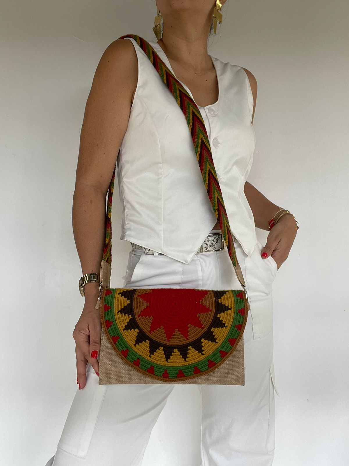 Bello bolso con tejido Wajuu. Me gustaria que el cuerpo fuera en la misma forma y tejido de la tapa, en un solo tono. El yute es lindo pero algo áspero.