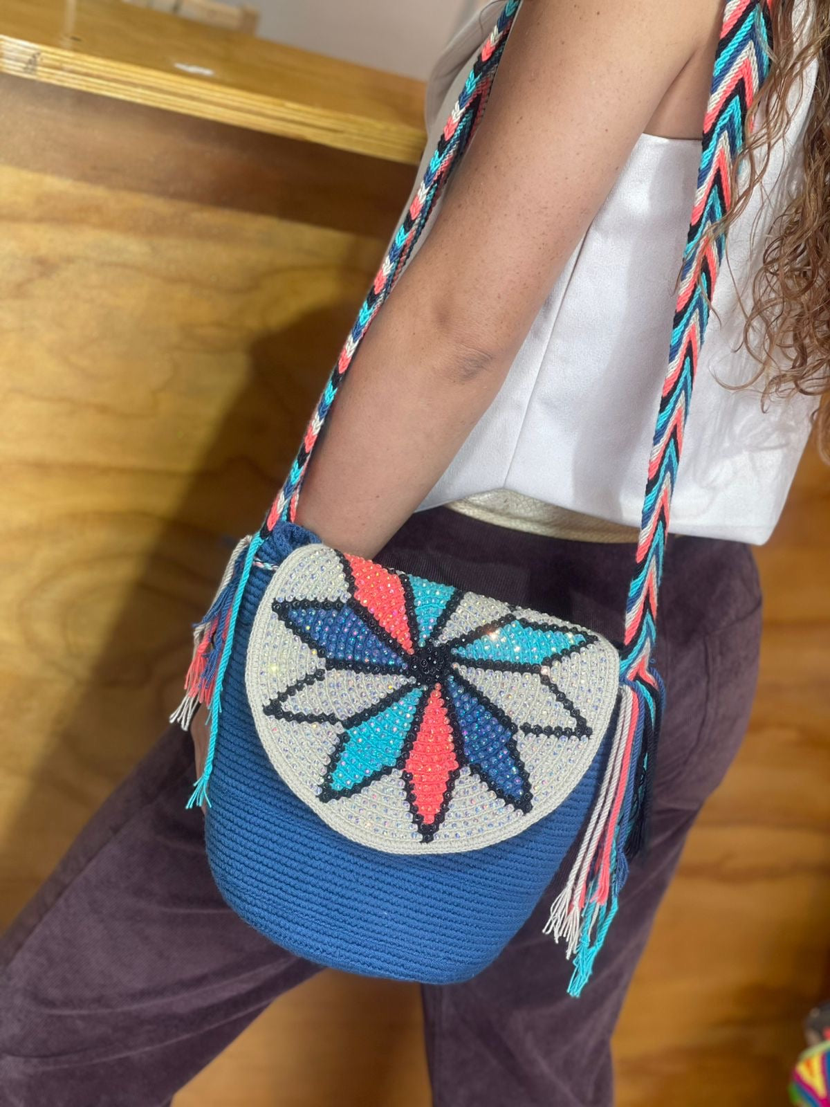 Esta mochila con tapa y piedras es una pieza única, tejida 100% a mano por la etnia Wayuú en la península de La Guajira, utilizando algodón silvestre de la mejor calidad. Su diseño tradicional, realzado con detalles de pedrería, ofrece un equilibrio perfecto entre funcionalidad y estilo. La pedrería, colocada con destreza por los artesanos, le da un toque de elegancia y distinción, mientras que la tapa proporciona un cierre seguro y práctico, ideal para quienes buscan una mochila resistente y con carácter para el día a día, sin perder la esencia artesanal. Con medidas aproximadas de 23 cm de alto x 21 cm de ancho y una gaza de 96 cm de largo. Disponibles para envío inmediato en una variedad de colores, esta mochila Wayuú no es solo un accesorio; es una verdadera obra de arte que te conecta con la tradición y la cultura de la Guajira.